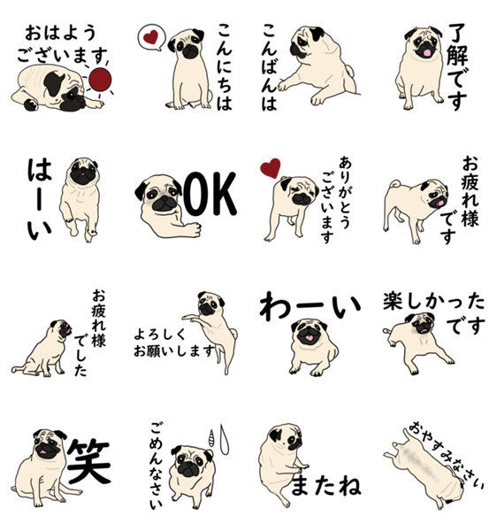 | スタンプ説明 | シンプルにまとめたパグのスタンプです。大人でも使いやすいスッキリ感**犬・パグ。敬語。日常。 |