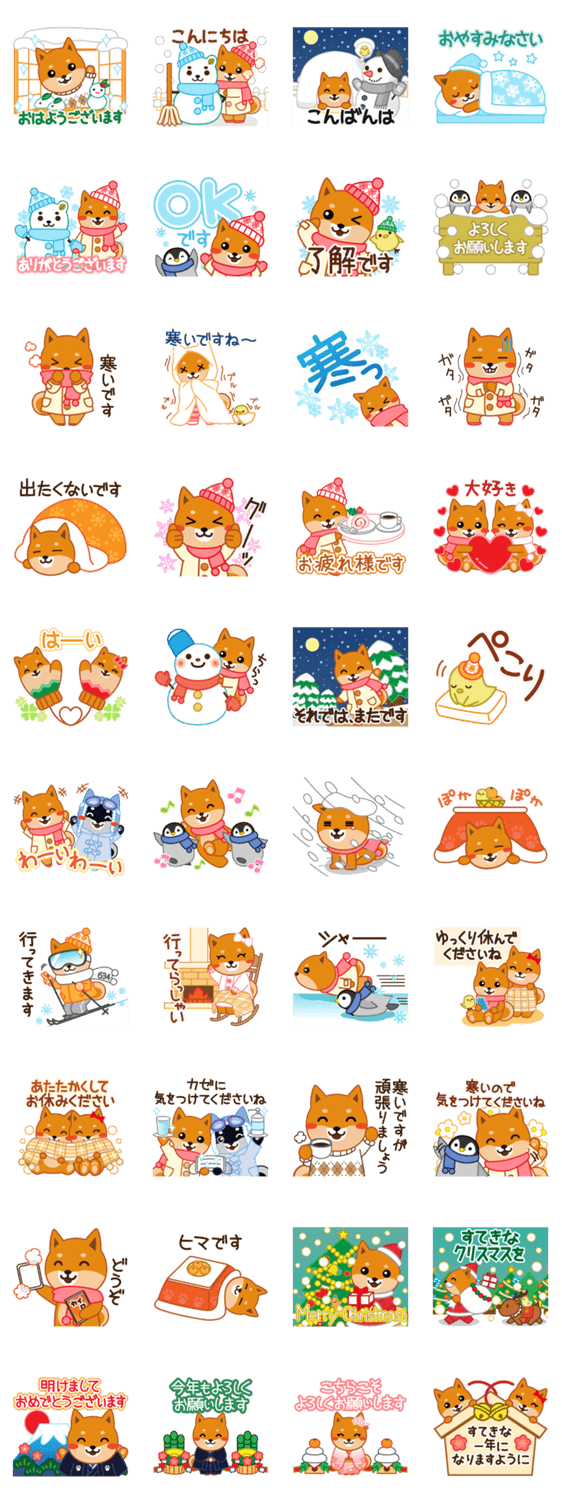 柴犬「ムサシ」第24弾です。冬のスタンプです。敬語版。 クリスマスのスタンプやお正月のスタンプも入っています。