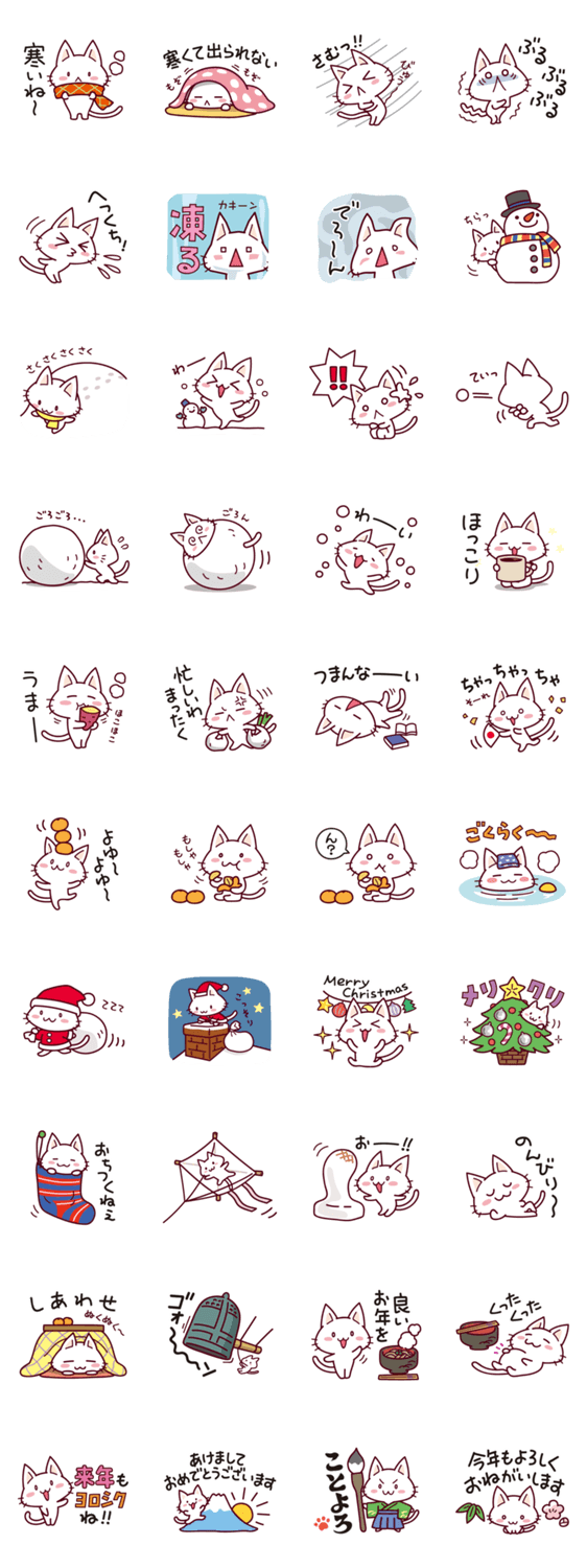 表情ゆたかなネコさんのスタンプ冬編。寒くなってもゆるっと自由気ままなネコさんです。クリスマスから年末年始まで使えるスタンプ入り!