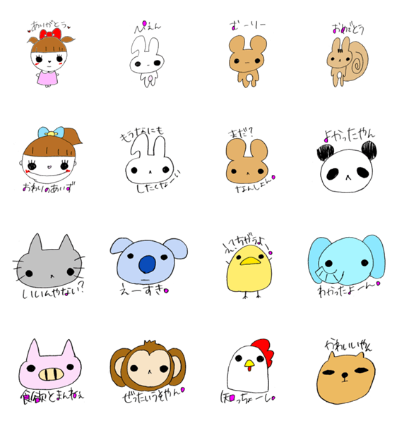 可愛いけど真顔な女の子と動物たちのスタンプです。