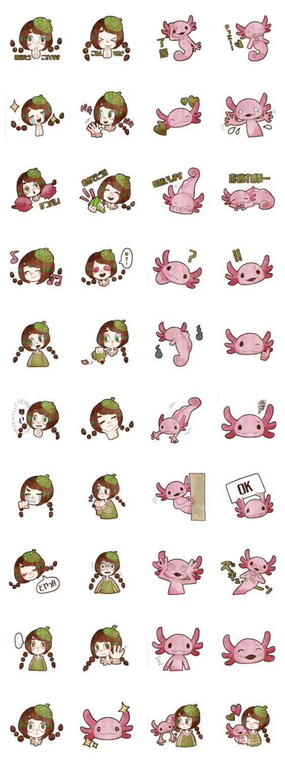 おばけウーパールーパーのもちと女の子のらんこのスタンプです。