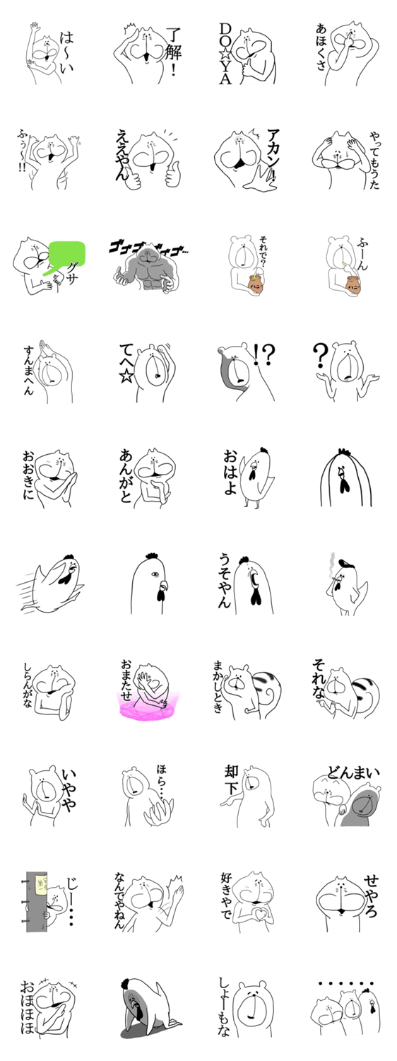 関西弁を話す、ヘンテコでちょっとうざい動物たちのスタンプです。ネコとクマとニワトリとリスがいます。