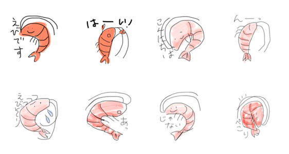 LINE Creators Studioでつくったスタンプです。「エビ課」で働くえびさんです。