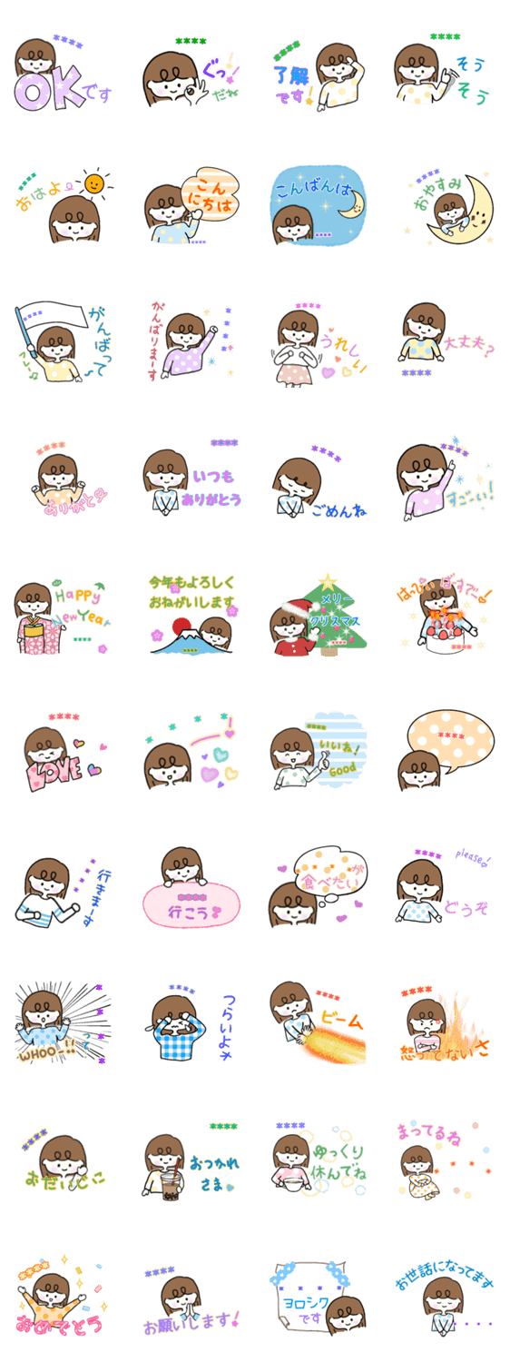オカッパ頭の女の子のカスタムスタンプです。よく使う言葉を中心に作りました。好きな言葉を入れて使ってね!