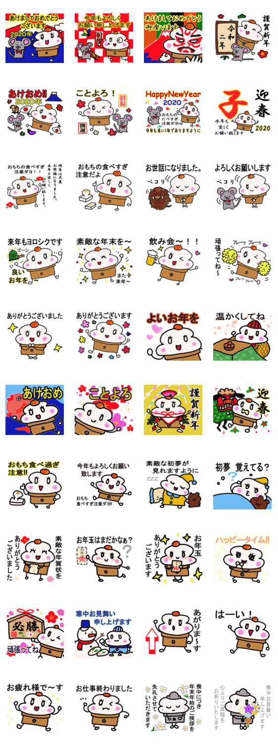 おもちのもちぴの新作、年末年始のご挨拶編のスタンプです。 ついつい食べ過ぎちゃうお正月。でも、おもちの食べすぎ注意ダヨ!!