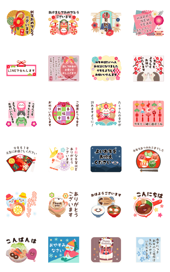 シリーズ好評の毎年使える動く第2弾。年末年始、謹賀新年あけましておめでとう、今年もよろしく、喪中。 付録はほっこり日常会話。敬語多めで目上の方にも丁寧なご挨拶福袋