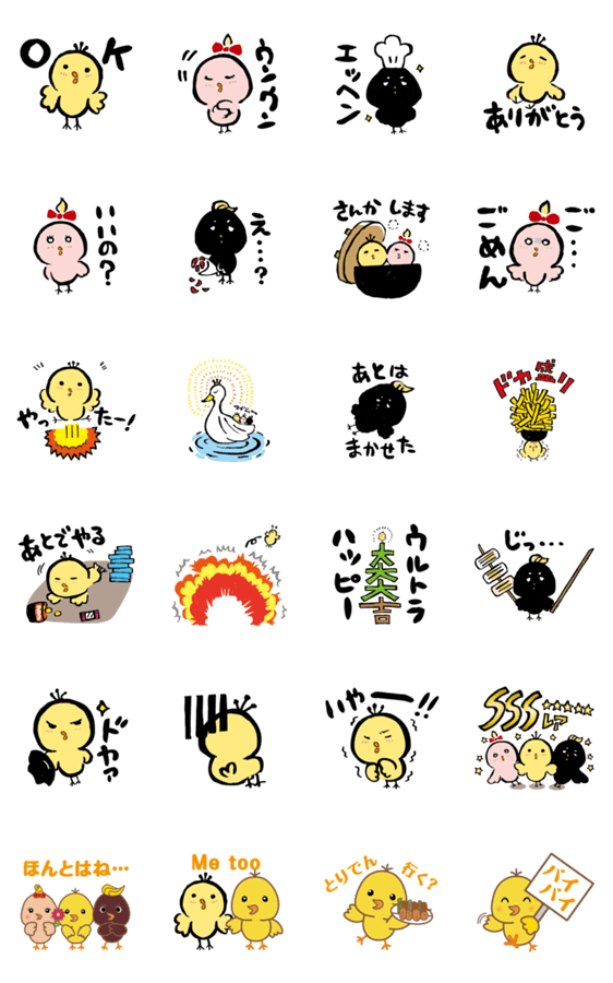釜飯と串焼「とりでん」のキャラクター「ぴよ太」がゆる~い姿になってスタンプに登場!ゆるくない姿もあるよ。