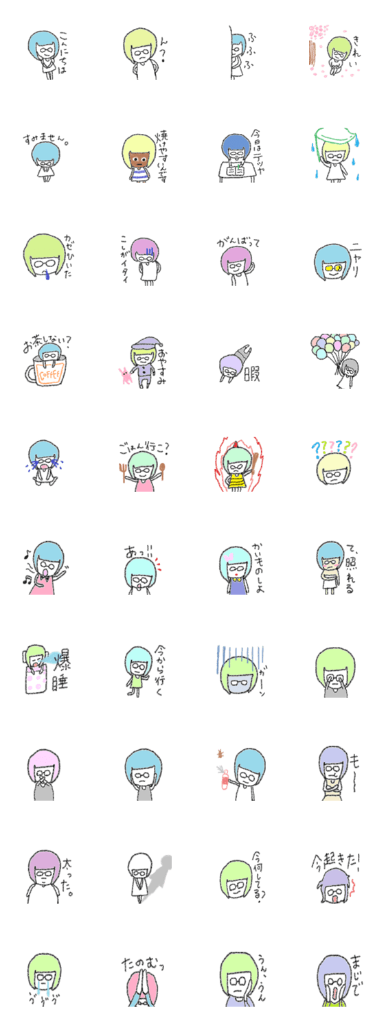 スタンプ説明 めがねがトレードマークの女の子のスタンプです。