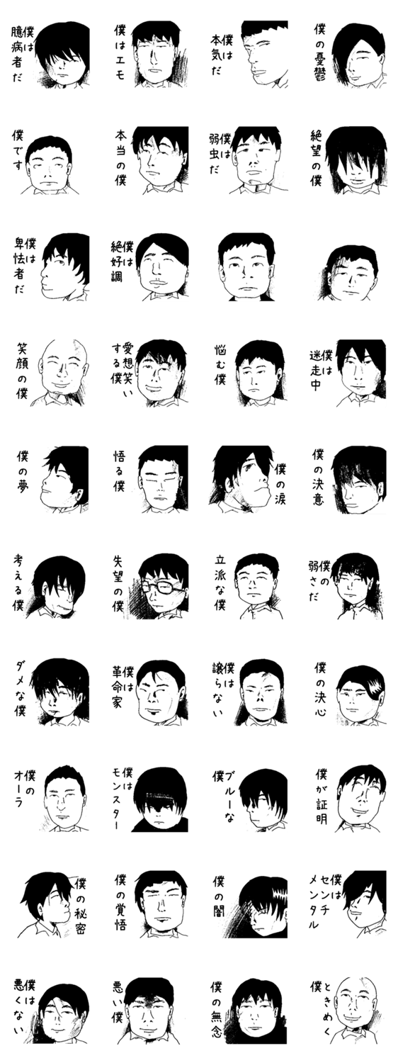 僕という存在。それは揺れ動く心。過剰な自意識。さまざまな心のゆらめきを披露してくれる「僕」のスタンプ。