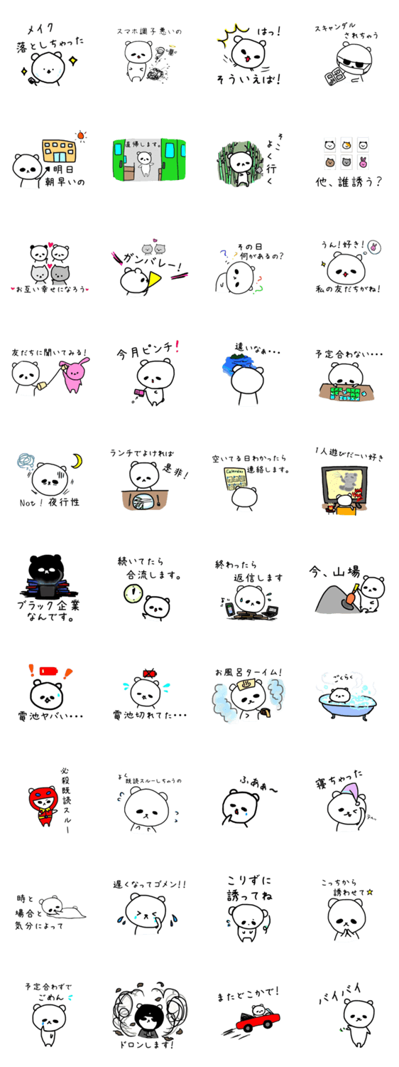| スタンプ説明 | 今日も白パンダはデートに誘われました。八方美人な白パンダは人間関係を器用に保ちます。 |