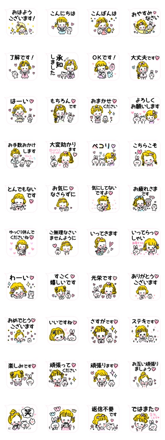 前作「ガーリーガールズ♡ソフトな敬語と日常言葉」を使用頻度の高い毎日使える敬語の挨拶言葉にまとめ、どのトーク画面にも映えるようにリメイクした女の子スタンプです。