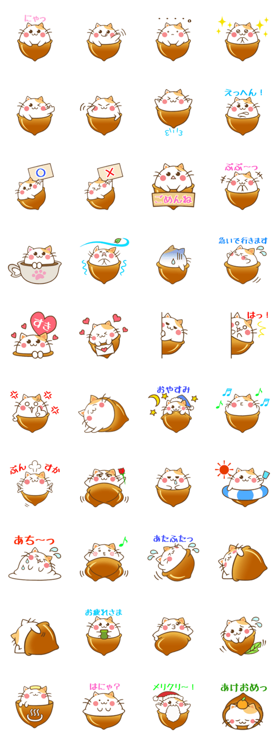 どんぐりを住みかにしているにゃんこのキャラクターです。お気に入りのどんぐりのカラを見つけてすっぽり入っています。