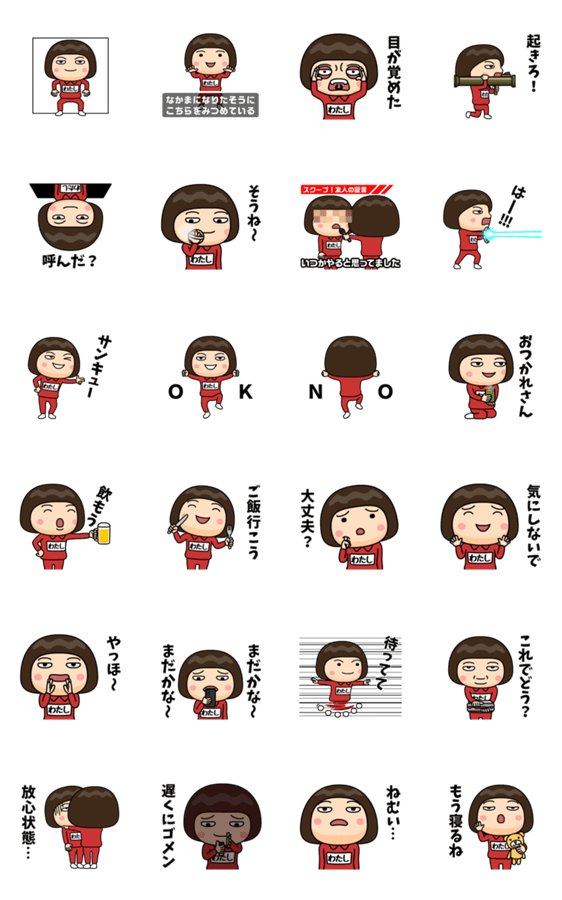 わたし(ワタシ)が使う芋ジャージの名前スタンプ『仲良しフレンド編』。友達と毎日使える挨拶や、ネタ満載のおふざけで使えるスタンプを詰め込みました!