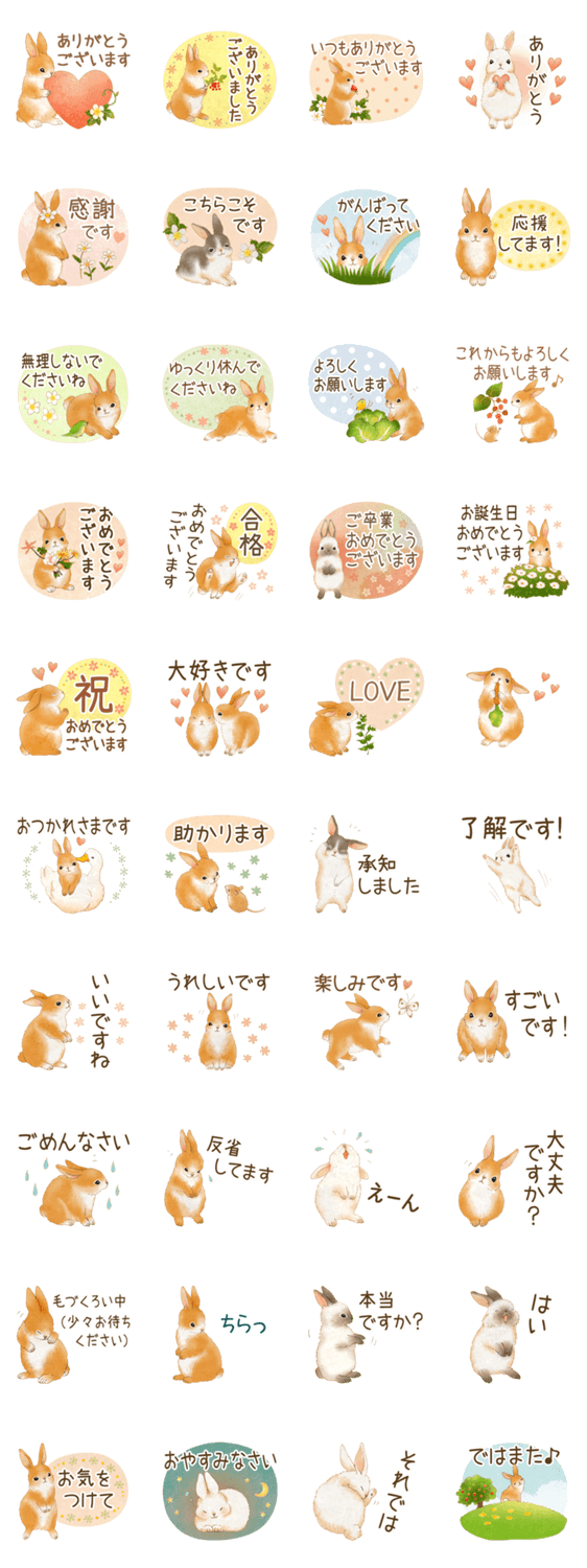 「おめでとう」「ありがとう」などの気持ちを伝えるものから日常使えるものまで、たっぷり40個♪ 手書きイラストのウサギたちの、やさしい敬語のスタンプです。