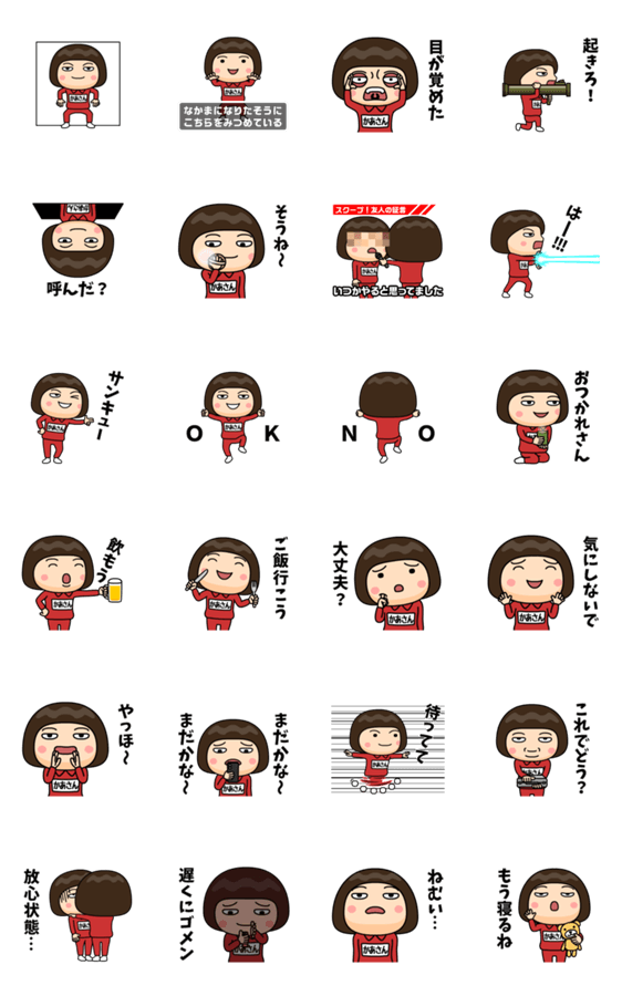 かあさん(カアサン)が使う芋ジャージの名前スタンプ『仲良しフレンド編』。友達と毎日使える挨拶や、ネタ満載のおふざけで使えるスタンプを詰め込みました!