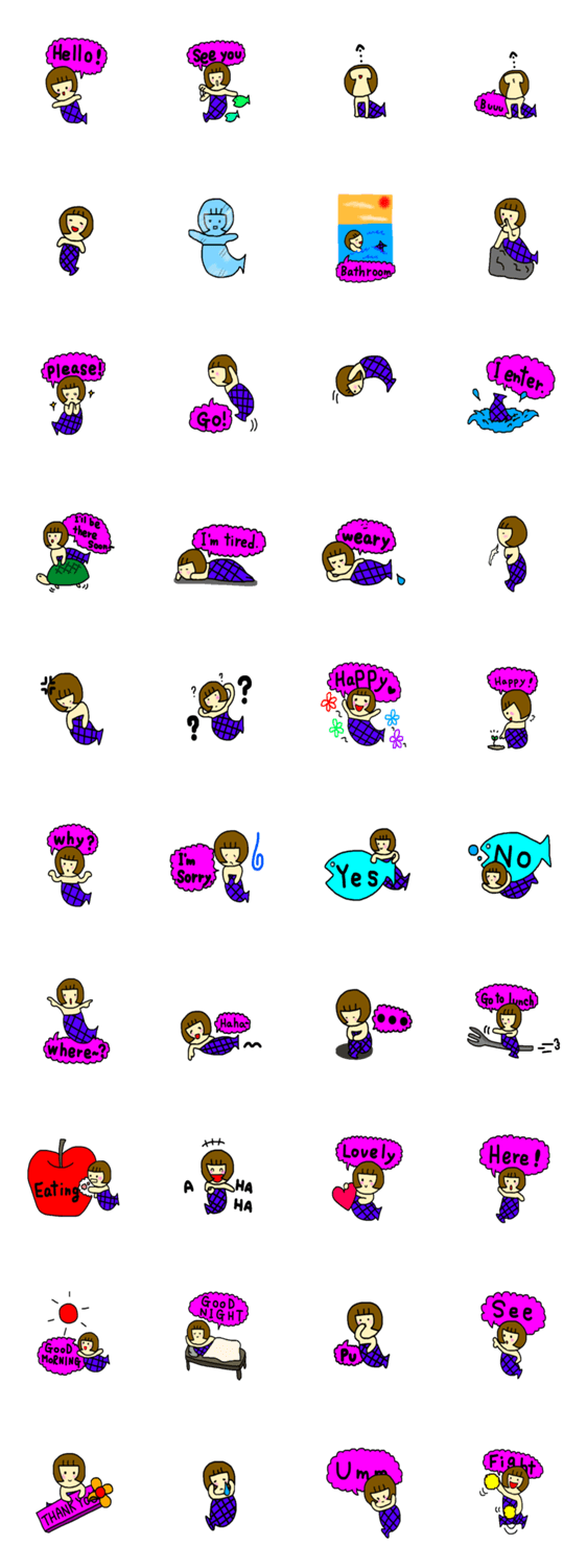 おかっぱ人魚の「まりちゃん」が海で動きます。日常で使う言葉や動作を英語で表現してみました。動作ののみもあるので、使いやすいスタンプも隠れています。