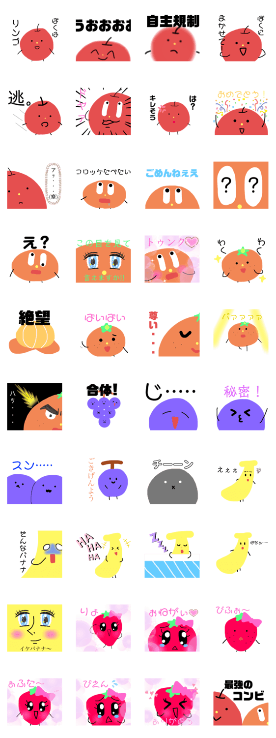 リンゴと愉快な仲間たちのスタンプです。前に作ったスタンプをリメイクしたやつが何個かあります。ご了承ください。