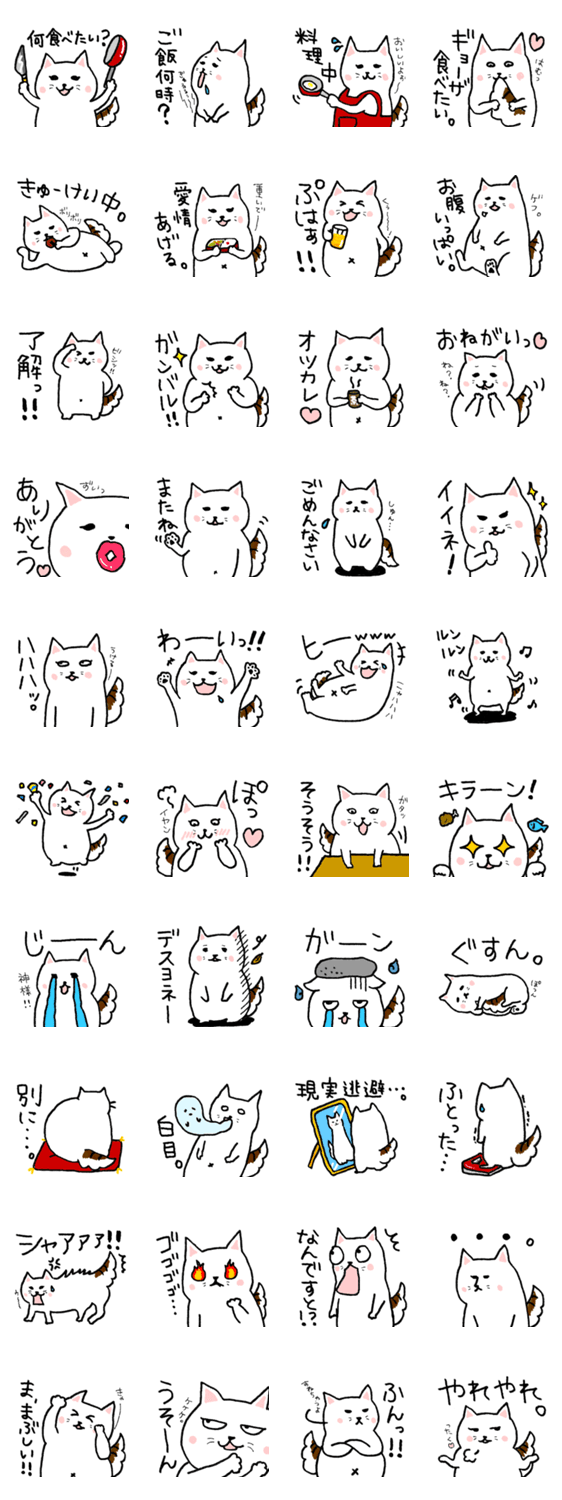 | スタンプ説明 | ごんちゃんキッチンの看板猫「ごんちゃん」の日常。長いマツゲと餃子の尻尾が特徴の、表情豊かなごんちゃんがあなたの気持ちをおもしろかわいく代弁! |