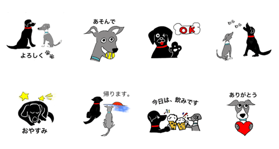 黒のラブラドールと子犬のイタグレが初めて出会ってから仲良くなるまでの姿や、その他の仲間たちを描いたスタンプです!