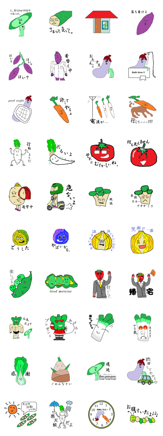 キモ可愛いお野菜たちのアホでバカだけど、どこか鋭い一言がトークを鮮やかにしてくれます。まるでサラダの鮮やかさの如しスタンプ。
