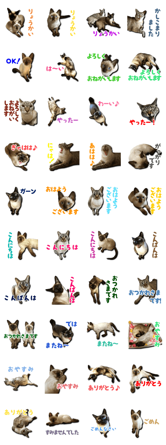 シャム猫えきさいてぃんぐきゃっつ!のメンバー5猫全員の“了解”など挨拶等々のスタンプです。