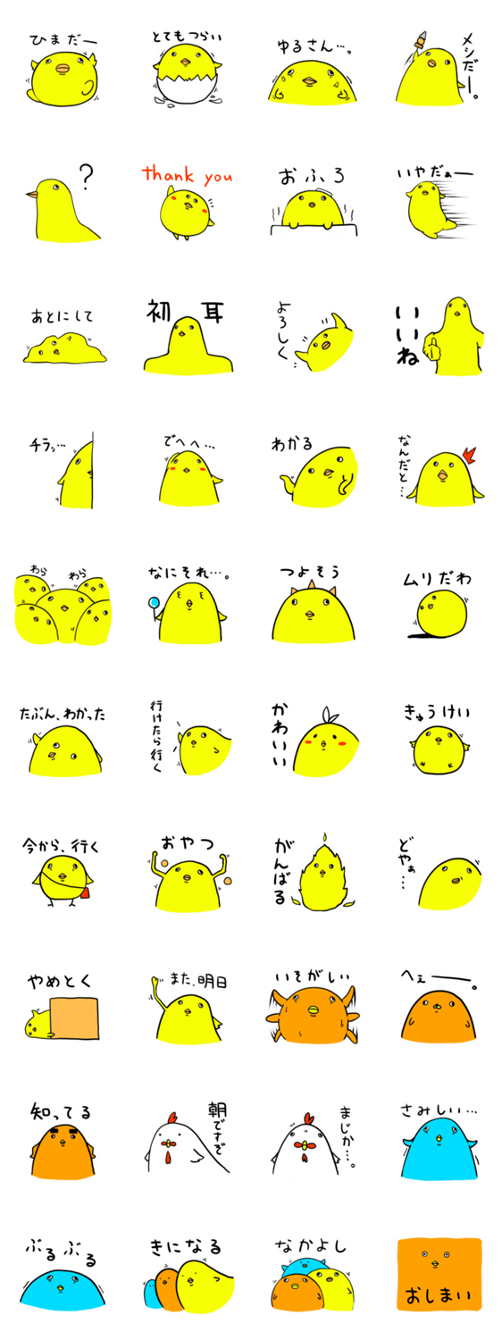 日常会話で使えるかわいいひよこのスタンプです。ひよこっぽくないけどひよこです。ひよこの仲間達もいます。