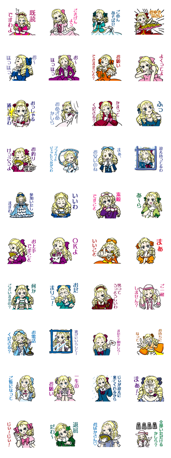 『ごきげんよう』『よくってよ』『おめざめかしら』『お~ほっほっほっ』などお嬢様が使える言葉のスタンプです