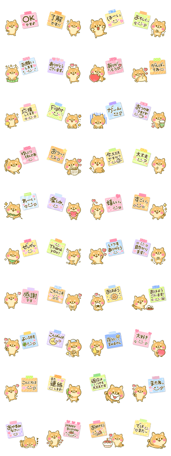 スマイルいっぱい♡元気いっぱいのカラフルな柴犬メモスタンプです♪まいにち使える言葉を集めました♡敬語も混ざって色々使えます♡