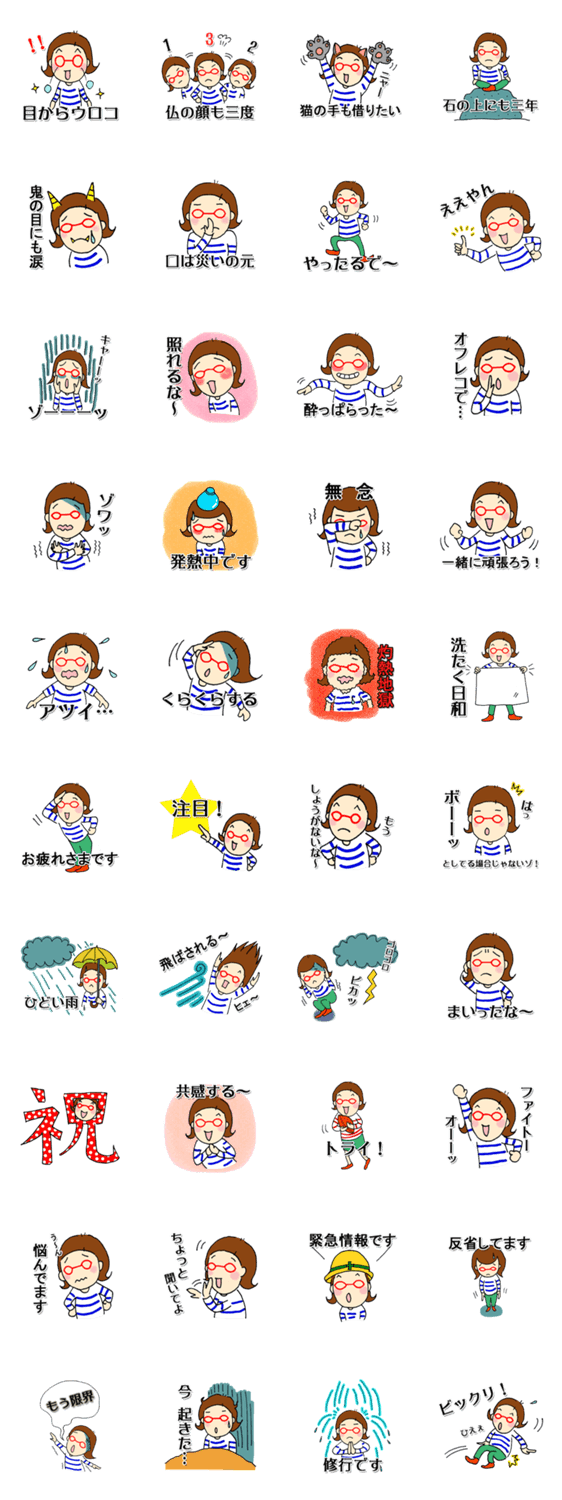 ヤスエさんスタンプ第14弾! ボーダーシャツと赤いメガネがトレードマークのヤスエさんです。