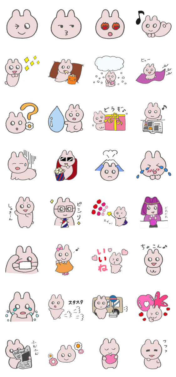 | スタンプ説明 | きら目のうさぎの日常と、非日常の間のような不思議なスタンプです。新聞を読んだりバスを待ったり、空を飛んだり...現実にありそうなものとないものをミックスしました♪ |