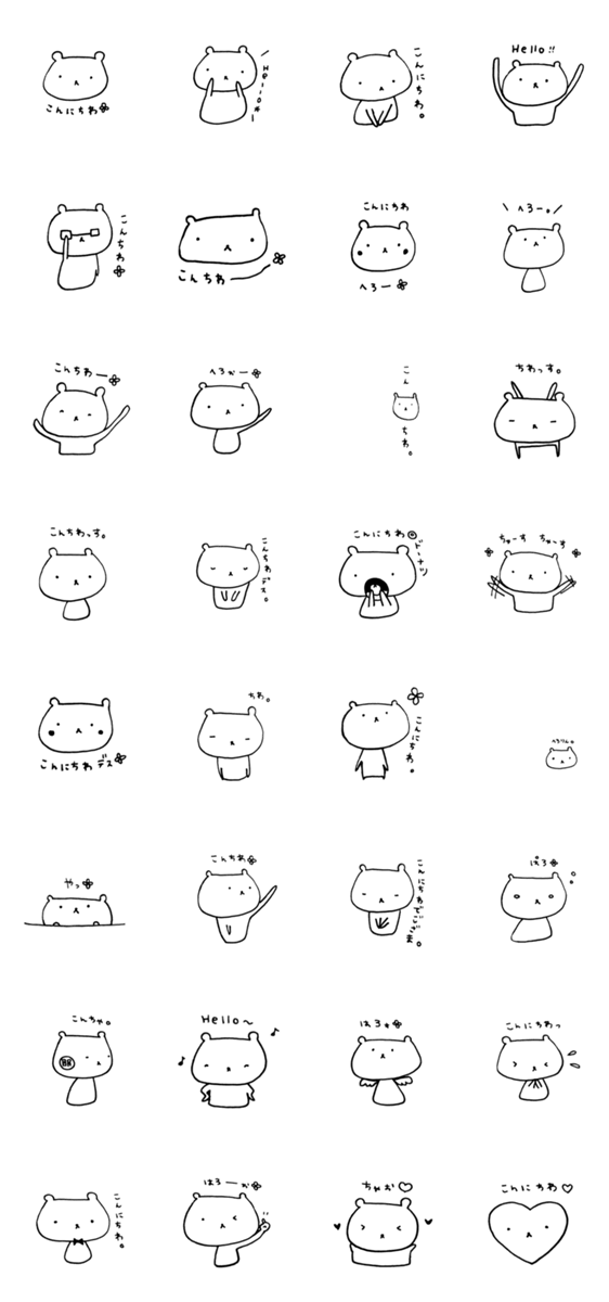 シンプルで、モノクロで、くまさんの「こんにちわ」ばっかりのスタンプです。何度も使うであろうお昼の挨拶、飽きさせません。*