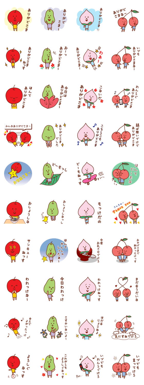 「山形弁のくだものがたりだもの」山形弁スタンプの続編です。山形生まれのとてもおいしいくだもの達が、山形弁で、たくさんのありがとうを伝えます。