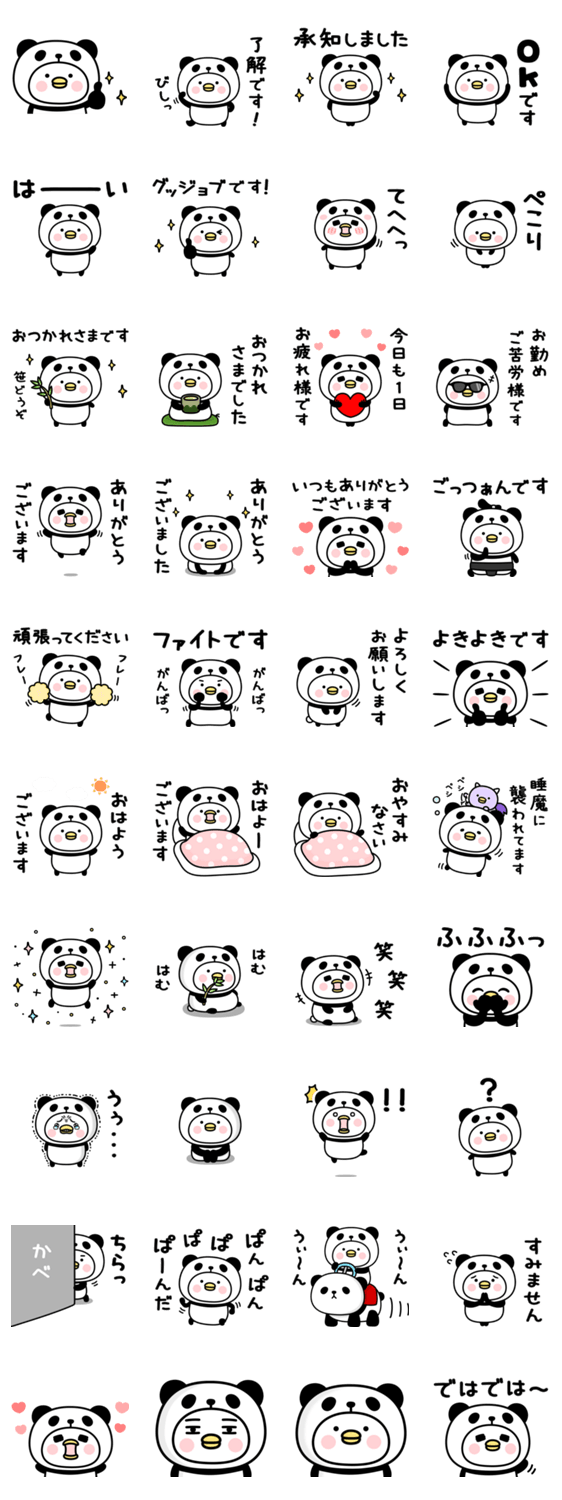 ちびトリのぱんだ着ぐるみ敬語スタンプです。