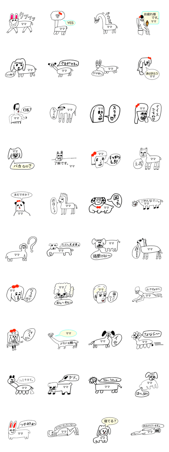 ママさん限定(専用)の毎日使える(使いやすい)お名前スタンプです。赤いリボンの人々やウサギ(うさぎ)さんや犬(いぬ・イヌ)さんなどが登場します。