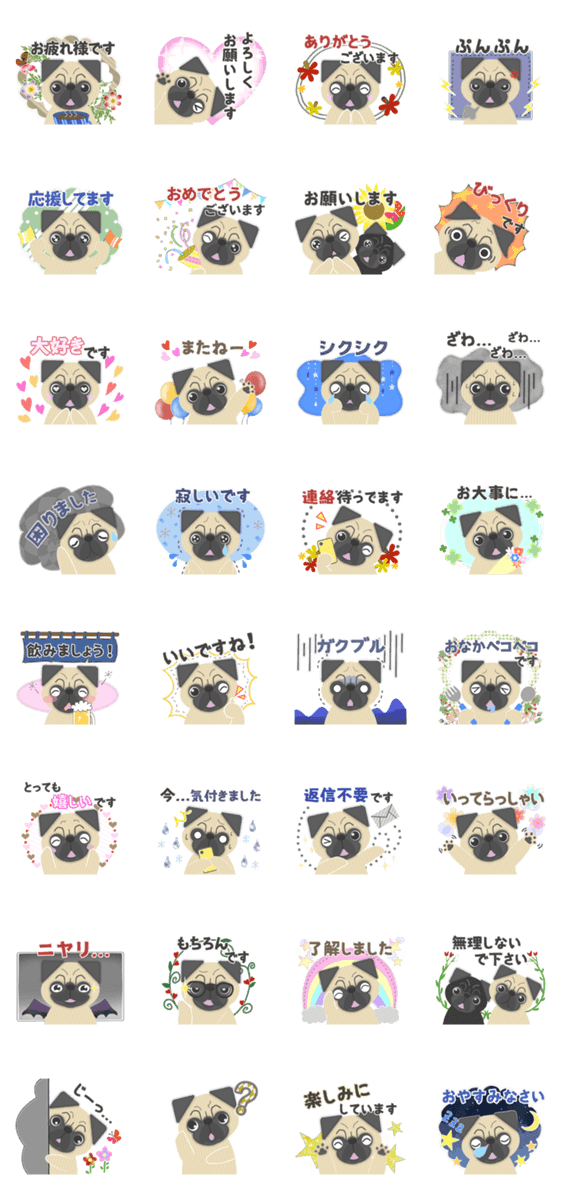 パグがあなたの代わりに可愛く気持ちを伝えます!よく使用する言葉から選びました。