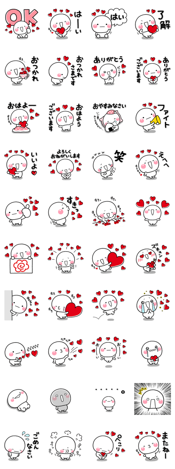 内容を厳選した使用頻度が高い基本言葉に、好きの気持ちが伝わるよう文字とハートをたくさん追加したしろまるのスタンプです。【作:いしいともこ】