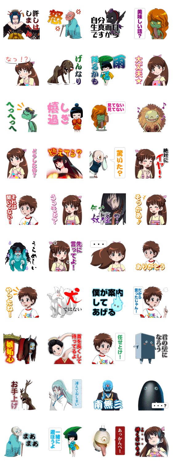 iOSアプリ「歌と森の妖怪屋敷」公式スタンプです。主要キャラクタ—「海」と「歌」をメインに、妖怪たちの楽し気な表情をお楽しみ下さい。