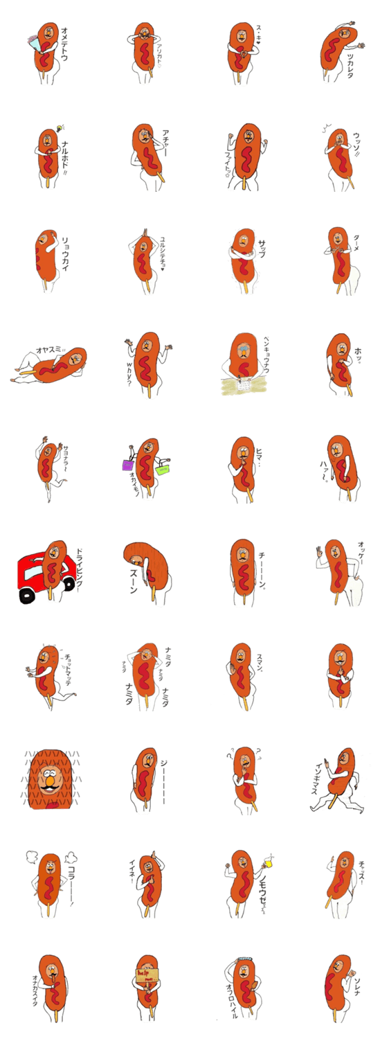 フランクフルトの着ぐるみを着たおじさん。ちょっと気持ち悪いけど、なぜか愛おしい…日常会話で使えるスタンプです。