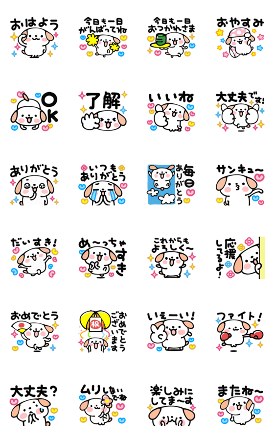 大きめ文字で見やすい!ハート&キラキラ多めの動くスタンプ。たれ耳がカワイイらぶらぶワンコです。日頃の感謝・応援したい人へのメッセージにどうぞ~。