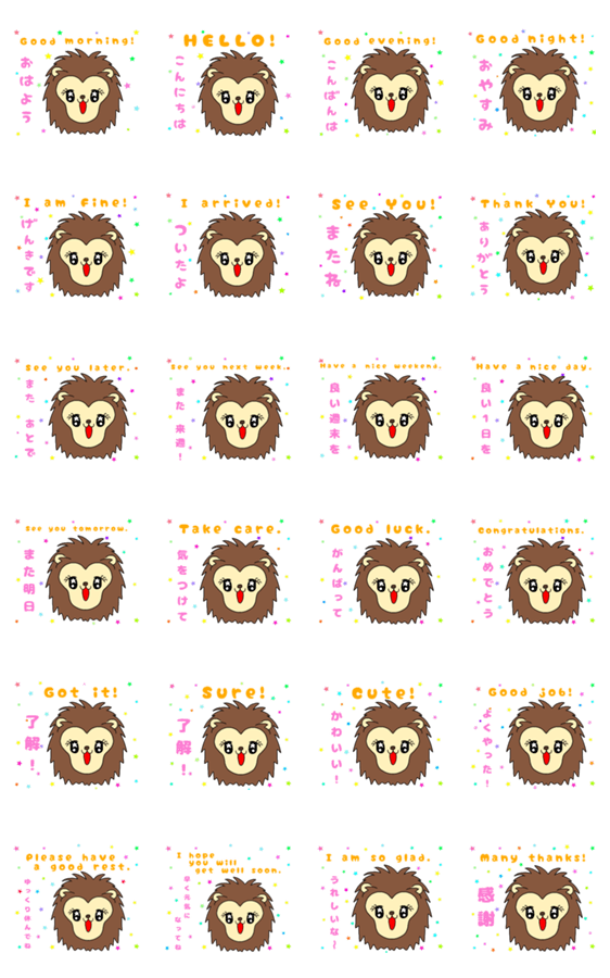 可愛いライオンのスタンプです。お友達やご家族に使ってみてね。日本語と 英語 のスタンプです。
