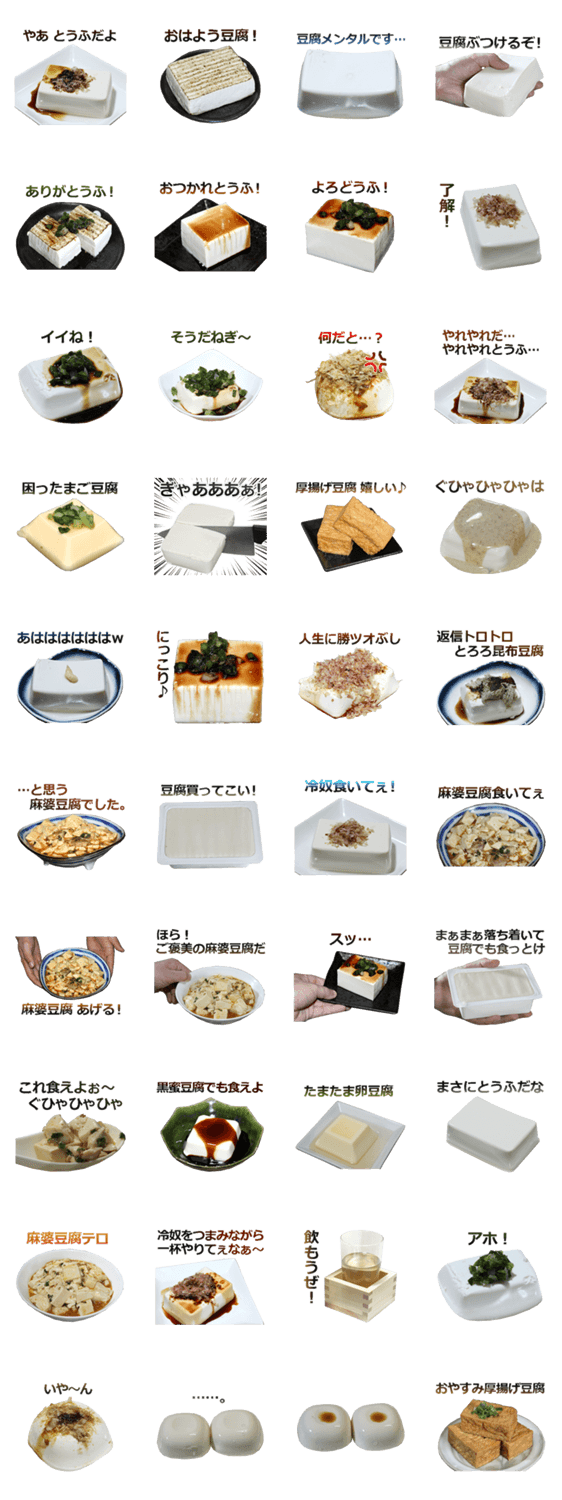 お豆腐の実写スタンプです!おかずにもサイドメニューにもお酒のつまみにもなる万能食材、とうふ!麻婆豆腐、厚揚げ豆腐、冷奴などいろいろ。飯テロにも。写真食べ物。