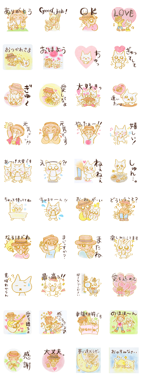 ギターを持った僕とネコのかわいい日常スタンプです。手書きイラストならではの温かさです!