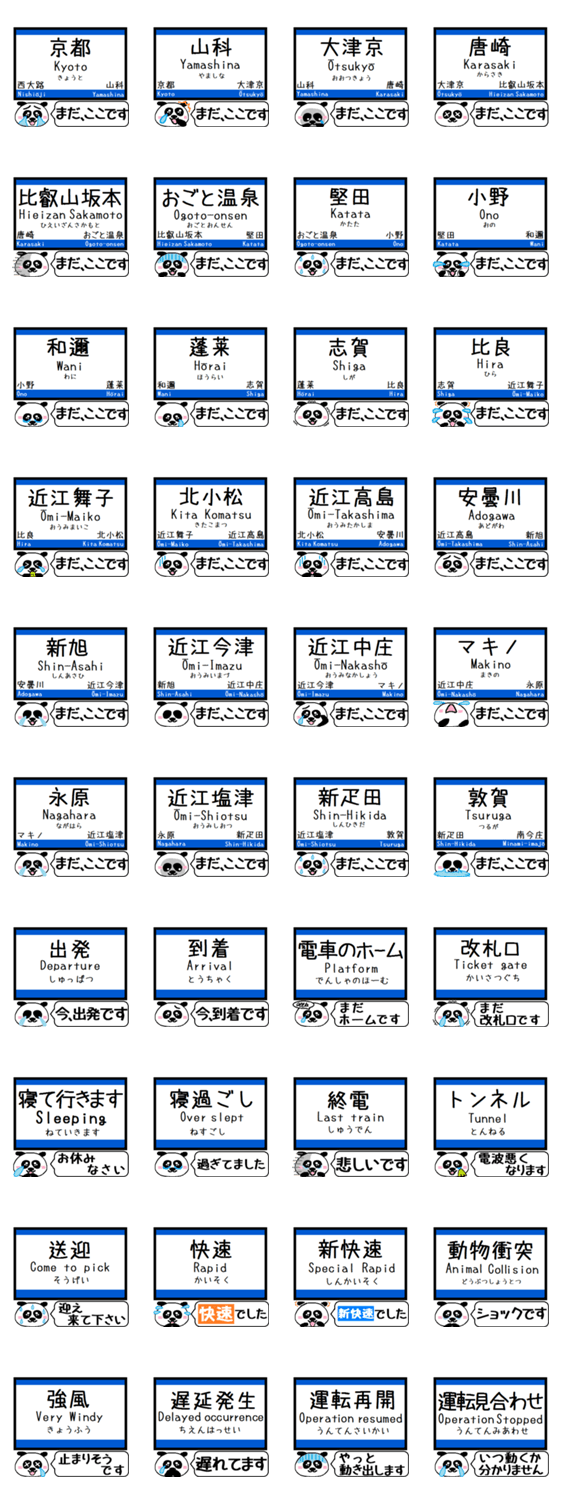 かわいいパンダが関西の湖西線(山科,大津京,唐崎,比叡山坂本,おごと温泉,小野,和邇,蓬莱,志賀,比良,近江高島,安曇川,新旭,近江今津,近江中庄,マキノ)京都,敦賀 駅名を連絡