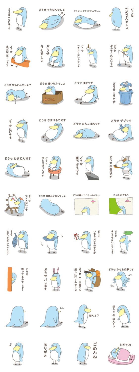 ”どうせ~” が口癖の飛べない鳥のスタンプです。いつもすねてばかりですがあなたが"どうせ~"と使うことがあればきっとこの鳥が役立つでしょう。