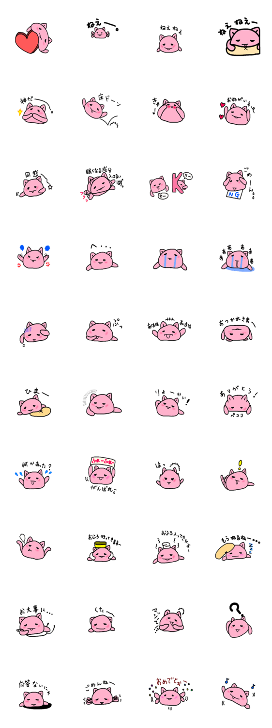 桃色の丸い猫ちゃんです。いつもだるだるな感じでスタンプ登場!日常で使えるスタンプやだるーい時とかどうですか?