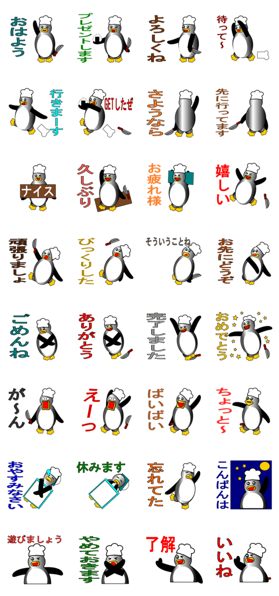 | スタンプ説明 | 料理を作るのが好きなペンギンです。料理は愛情がモットーです。 |