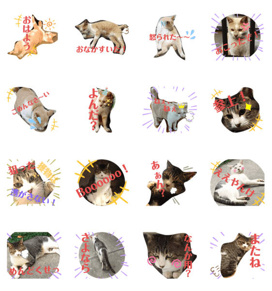 やじまちゃん、他歴代の保護猫たちのスタンプです。ちょっと態度が大きめです。