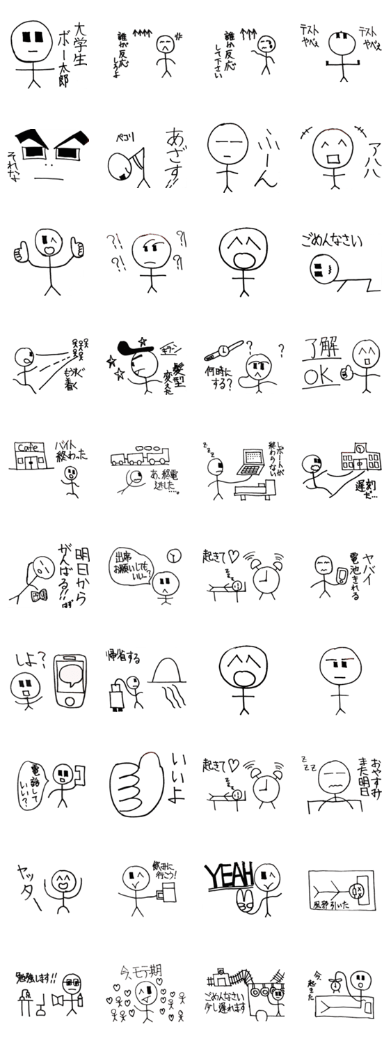 | スタンプ説明 | 絵を書くのが苦手な人が精一杯がんばって描いた棒人間です。大学生が使いそうなものを集めました! |