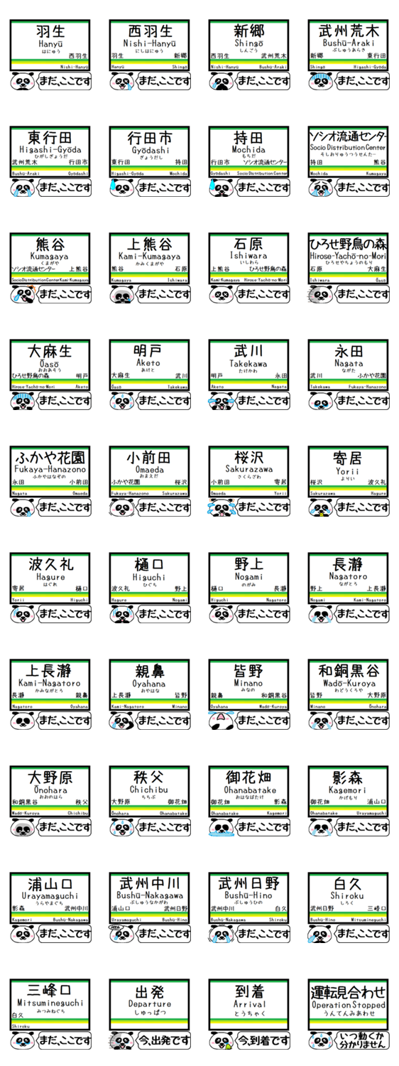 かわいいパンダが秩父(羽生,新郷,行田市,持田,熊谷,明戸,武川,永田,ふかや花園,小前田,桜沢,寄居,樋口,野上,長瀞,親鼻,皆野,大野原,秩父,御花畑,影森,白久,三峰口)駅名連絡