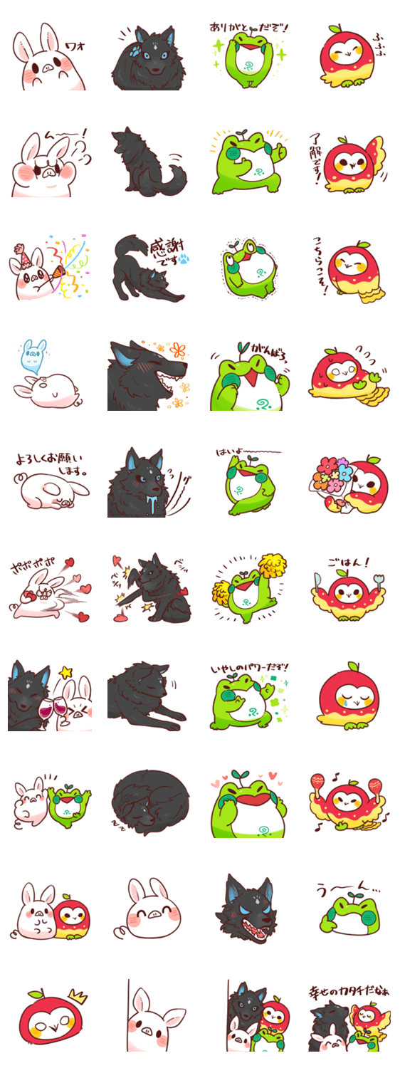 子ぶたのうりたスタンプ第二弾!今回はうりたのお友達、オオカミのくりむき君、カエルのちゃすけ君、フクロウのあぽさんも来てくれたよ!
